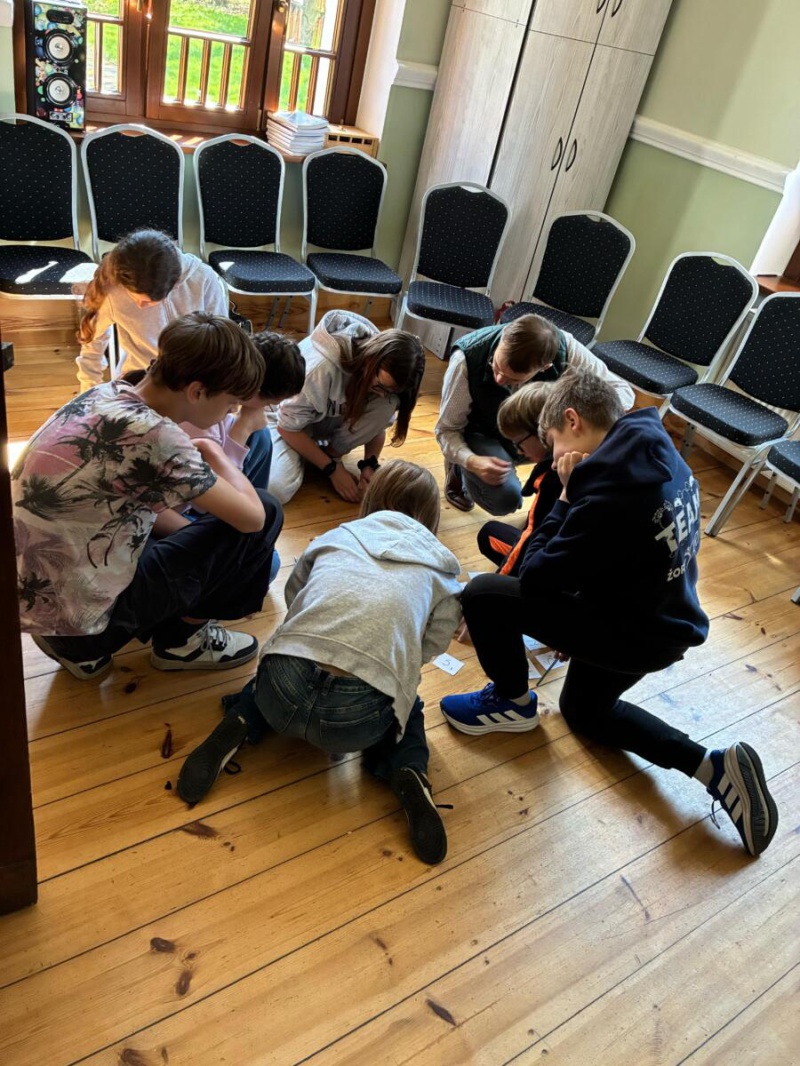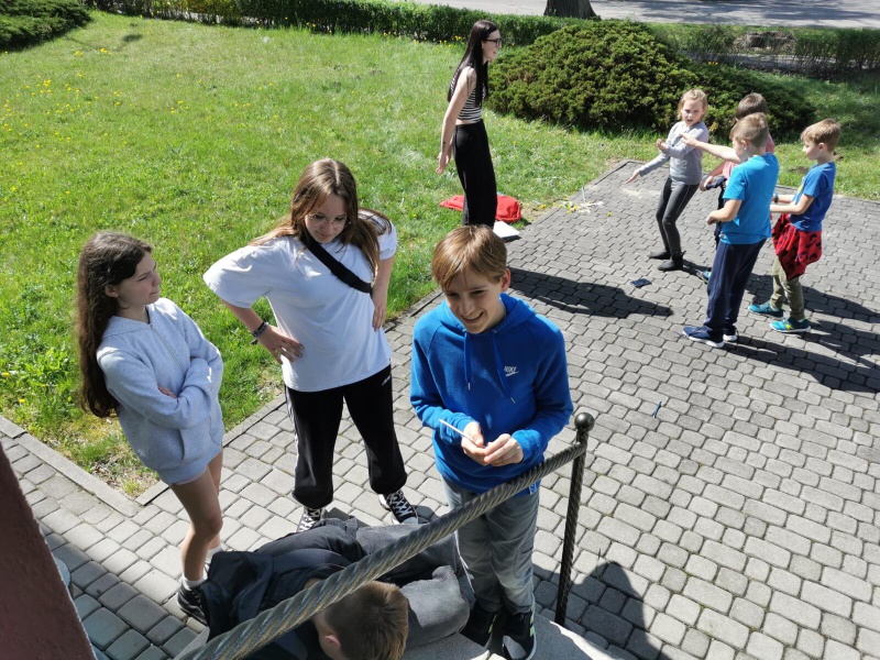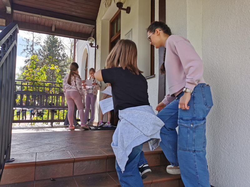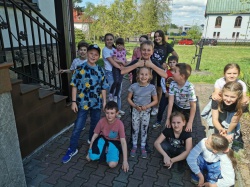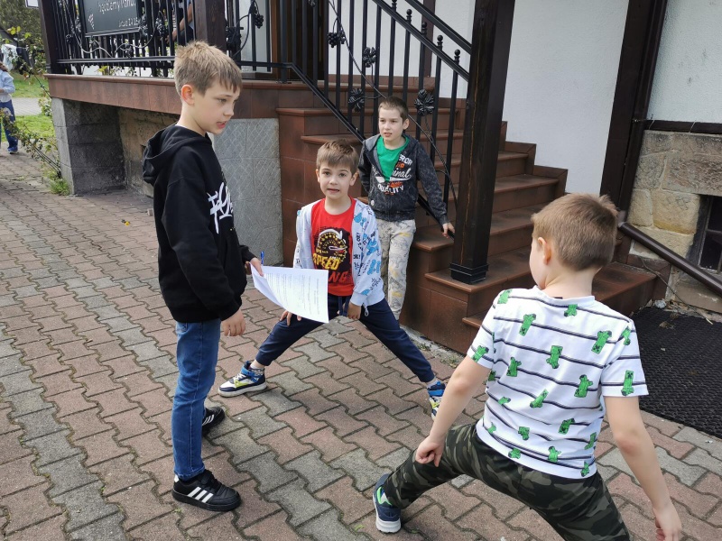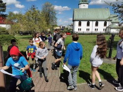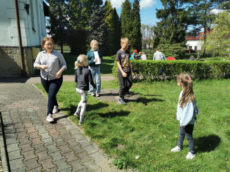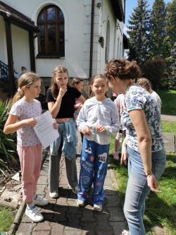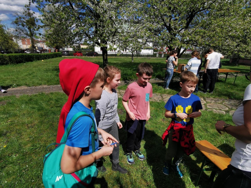 Następnie po „słodkiej przerwie” na posiłek, rozprostowanie się, a w zasadzie rozbieganie i dalszą integrację naszych dzieci, przyszedł czas na Scavenger Hunt – grę terenową w mniejszych grupach, gdzie dzieci zdobywały informacje o naszej Parafii, budynkach, a nawet otarły się o język hebrajski.