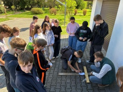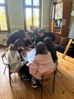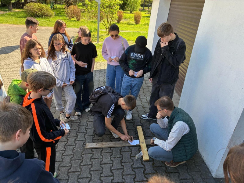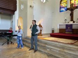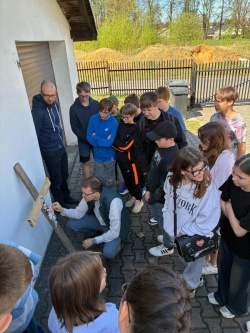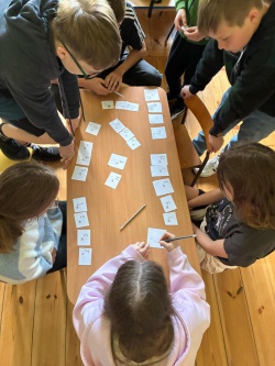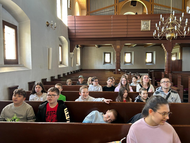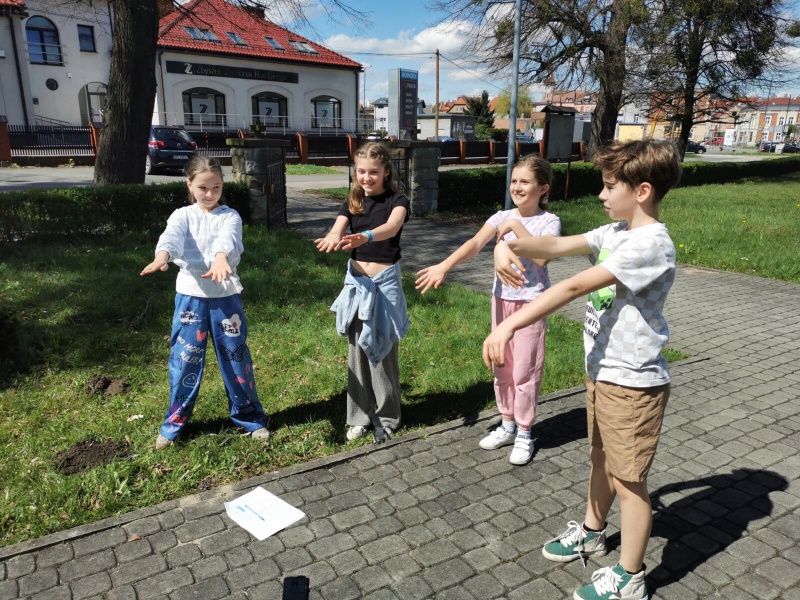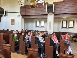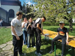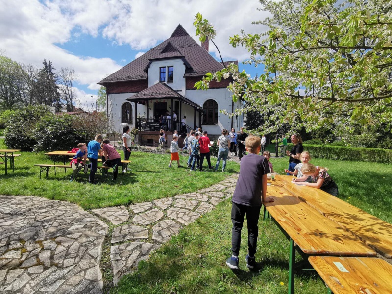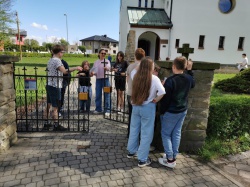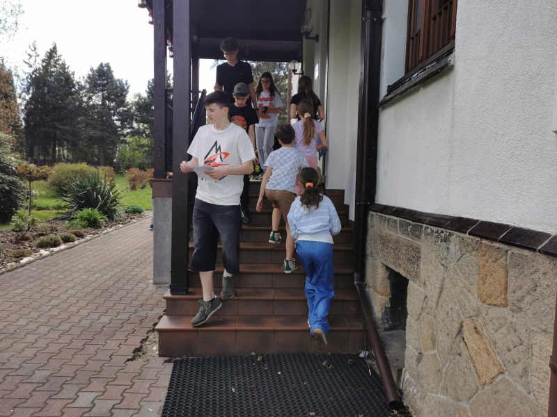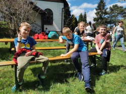 Następnie po „słodkiej przerwie” na posiłek, rozprostowanie się, a w zasadzie rozbieganie i dalszą integrację naszych dzieci, przyszedł czas na Scavenger Hunt – grę terenową w mniejszych grupach, gdzie dzieci zdobywały informacje o naszej Parafii, budynkach, a nawet otarły się o język hebrajski.